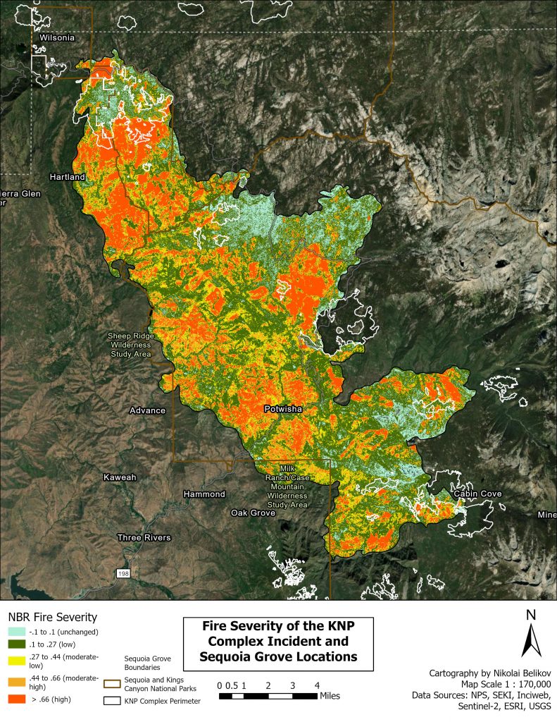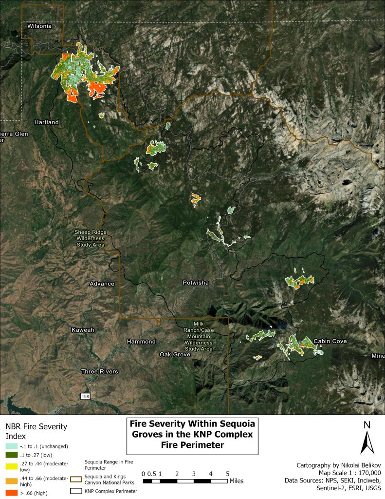 - The NPS estimates 1,330 to 2,380 sequoias have died or will die from the KNP Complex Fire. These estimates are likely more accurate due to increased knowledge and surveying of sequoia groves along with individual sequoia stem map data which was not available for this study (“2021 fire season impacts” – NPS).