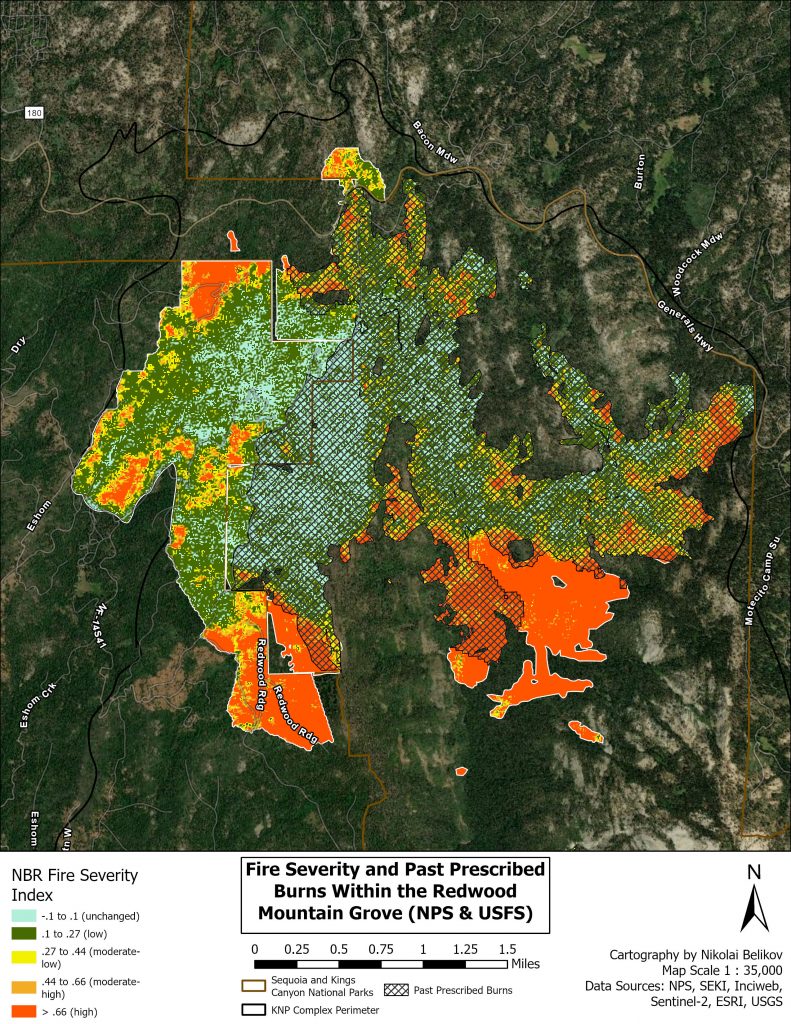 - A crosshatch fill overlay illustrates the extent of past prescribed burns in the Redwood Mountain Grove, illustrating how areas treated in the past are less likely to experience high severity fire.