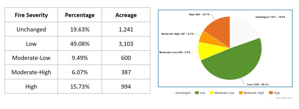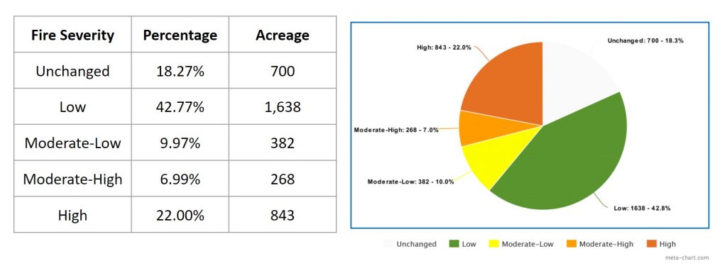 - Our analysis found that 22.0% of the grove burned at high severity, which matches the National Park Service value of 22% high severity burn in the Redwood Mountain Grove (“2021 fire season impacts” – NPS). The other fire severity classes show some discrepancy likely due to the use of different burn indices and analyses.
