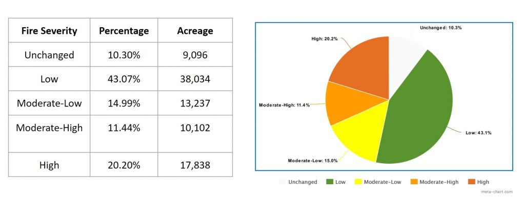 - Around 46.6% of the fire burned at a moderate to high severity.
