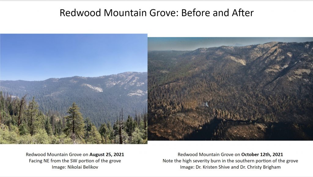 - Redwood Mountain is the world’s largest old growth Giant Sequoia grove and 97% of the grove’s 3,946 acres burned in the KNP Complex Fire (3,830 acres inside fire perimeter).